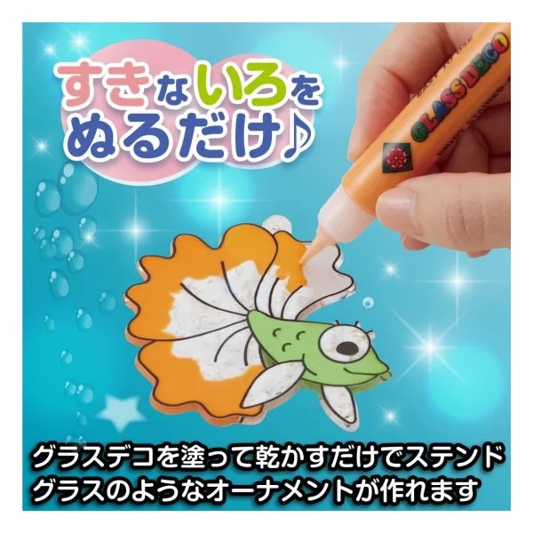グラスデコは、のりと絵の具が合体した、乾くとステンドグラスに似たカラフルで透明感のあるシールになる、クリアカラー絵の具です。