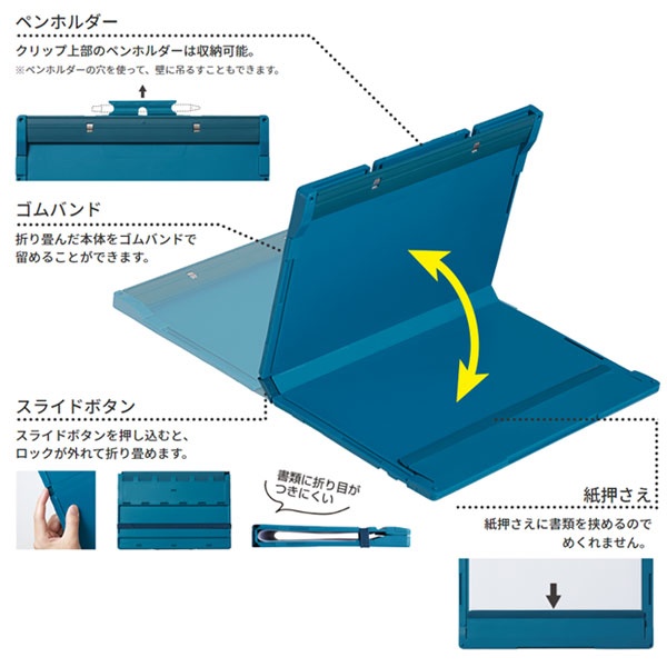 - 半分に折り畳んで、コンパクトに持ち運べるクリップボード