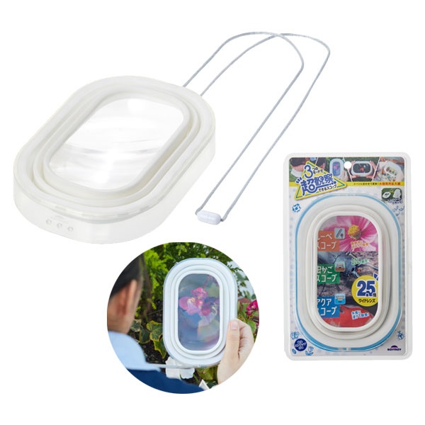 デザイン面では、無色透明のフレーム、白色のレンズフードにすることで、「虫かごスコープ」時に外の明るさを取り込み、明るく観察できるようになっています。