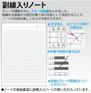 縦横等間隔に入った副線を用いることで、より方眼ノートに近い感覚で使用することができます。その為文頭を揃えたり作図がしやすい特徴があります。また、副線が薄青に入っているのでコピーしたときに写りこみにくいです。