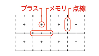 マスの中央にプラスを、横罫ライン上にメモリを付け、縦に点線を入れて区切ることで、文頭を揃えたり図形が書きやすくなっています。横罫と方眼罫のいいとこどりの罫です。